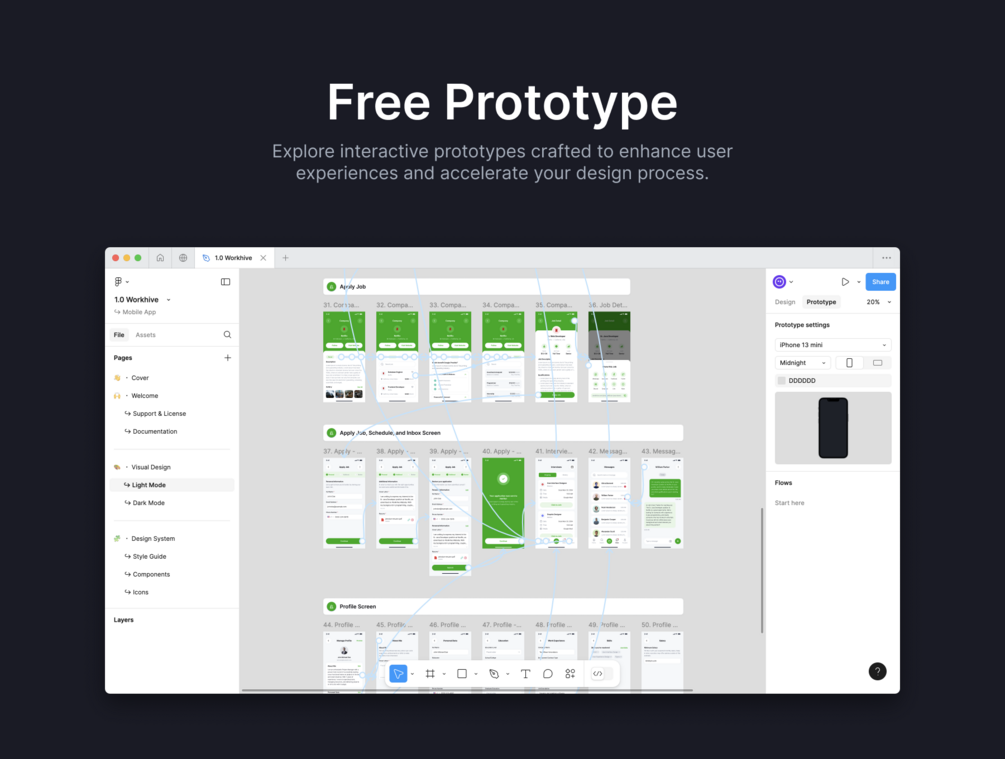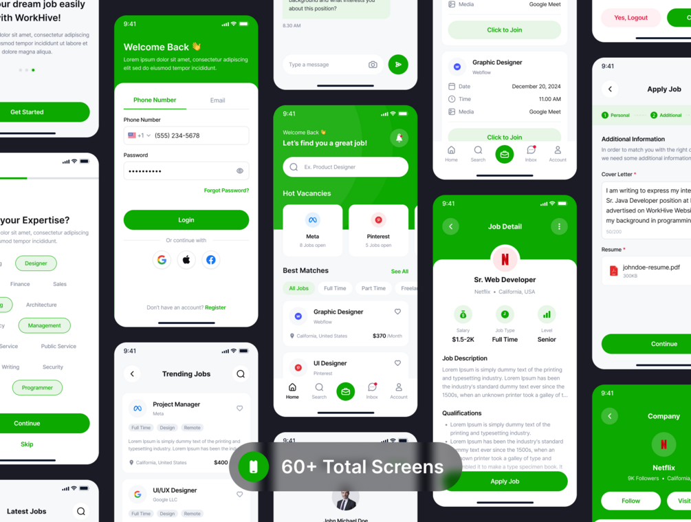 Workhive is Job Finder App UI Kit with detailed high-quality screens and easy to use in Figma. We designed 60+ light theme & 60+ dark theme mobile app design screens.